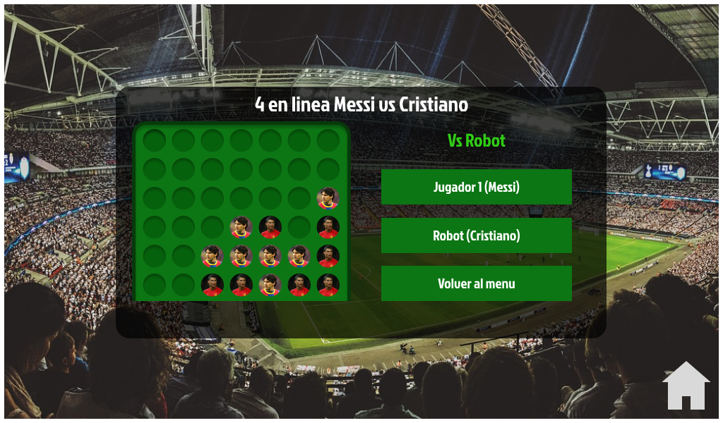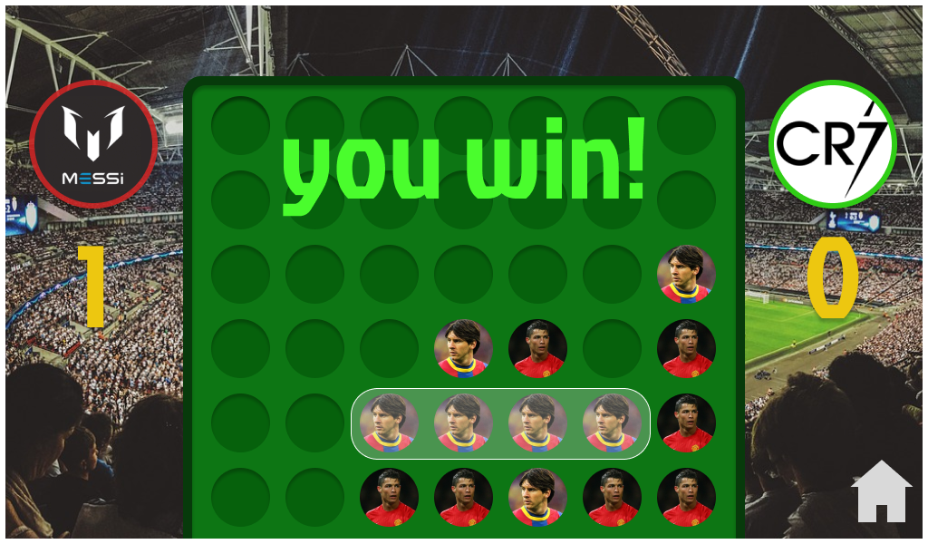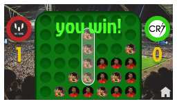 The rules of the 4 in line Messi vs Cristiano are very simple. It is always played between 2 players and on a 7x6 square board. On each turn, each player places a token of his character in a column and it falls to the first available space. The one who manages to place 4 tiles of the same character in a row horizontally, vertically or obliquely wins. If no one succeeds, the game ends in a draw.