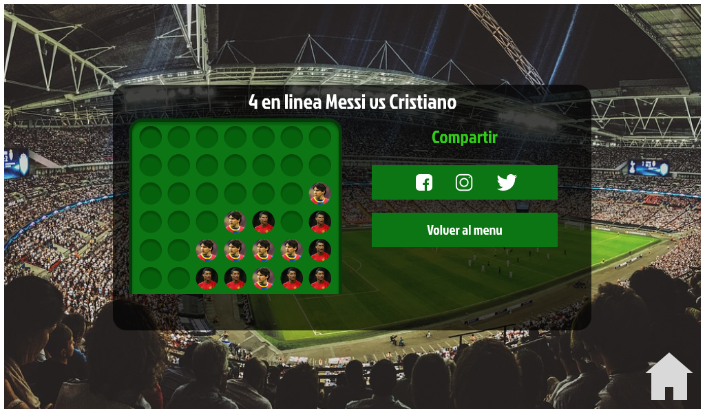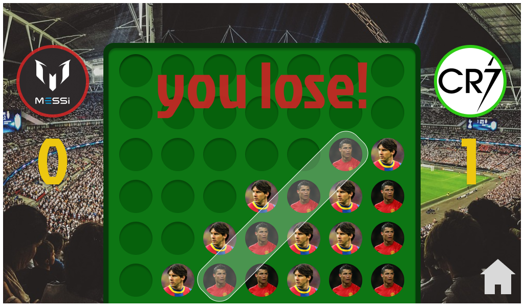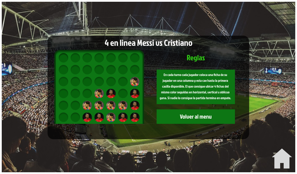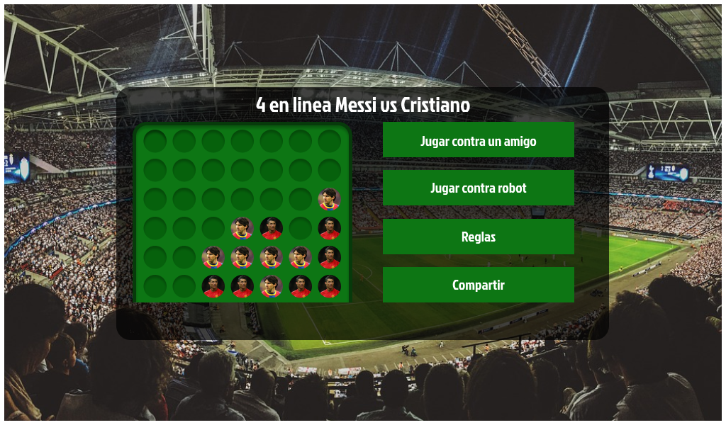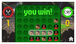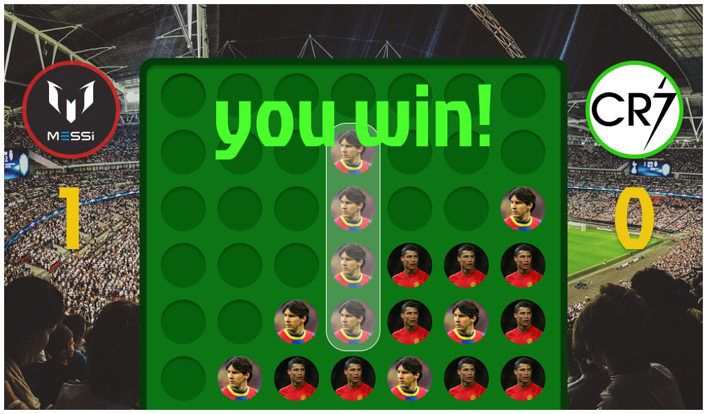 The rules of the 4 in line Messi vs Cristiano are very simple. It is always played between 2 players and on a 7x6 square board. On each turn, each player places a token of his character in a column and it falls to the first available space. The one who manages to place 4 tiles of the same character in a row horizontally, vertically or obliquely wins. If no one succeeds, the game ends in a draw.