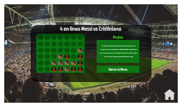 "4 online Messi vs Cristiano" is a personalized game that refers to the historical "Connect 4". It is a game of reflection for children and adults that was released in 1974. Connect 4 became popular very quickly since the rules of the game are very simple, however the strategy to win requires experience on the part of the players. It is an excellent game to make your children's brain work. Similarly Connect 4 can be played on a sheet of paper with round tiles of different colors, this game will pass the time quickly if you have a long trip or boring courses. At RetroGames.com you can play 4 in a row Messi vs Cristiano with your friends or with the robot. Read our game strategies and be number one!